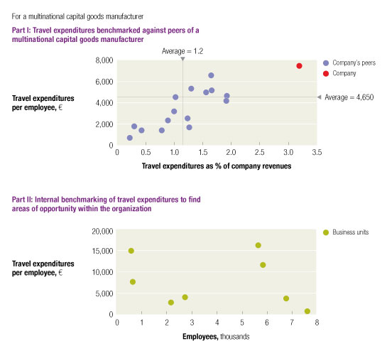One multinational capital goods manufacturer combined the two perspectives, analyzing the major categories of expenditure and developing targets based on both internal and external benchmarks. Using external ones for travel spending, managers found that the company’s travel costs were higher than those of any peer—both per employee and as a percentage of revenue (Exhibit 2). They then set an aggressive target to reduce travel expenses—and, to make the effort stick, instituted new travel policies on booking hotels and airfares. By examining internal benchmarks across suborganizations (such as departments, business units, or locations), managers also identified which executives needed to better educate their organizations on travel policy. In addition, they increased accountability by tracking each unit’s performance on a monthly basis to measure compliance and encouraged underperforming divisions to manage their travel costs more aggressively. The effort changed travel behavior across the entire organization as subunits shared best practices.