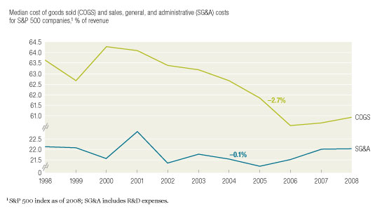 On either schedule, any programs initiated in the early months of the downturn are already beginning to fail—just as savings would be most useful to finance growth. Sales, general, and administrative (SG&A) costs prove to be particularly intransigent. While manufacturing efficiencies have enabled an average S&P 500 company to reduce the cost of goods sold (COGS) by about 250 basis points over the past decade, SG&A costs have remained at about the same level (Exhibit 1).