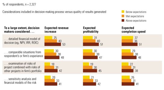 Overall, outcomes for these decisions were good. Among decisions for which the outcome was known, about two-thirds met or exceeded executives’ expectations for revenue growth and cost savings.3 Furthermore, strong majorities of respondents say the results of their initiatives met their expectations for speed, implementation cost, and gains in market share or efficiency.