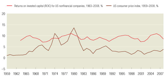 Although this example is stylized, the conclusion applies to all companies: after each acceleration in inflation, reported earnings should be expected to outpace inflation, and reported sales margins and returns on capital to increase, even though in real terms nothing has changed. Unfortunately, history shows that in periods of rising inflation, companies do not achieve big improvements in reported returns on capital. Those returns have been remarkably stable, at around 8 to 11 percent, in the United States—even during the 1970s and early 1980s, when inflation hit 10 percent or more (exhibit). If companies had been successful in passing on inflation’s effects, they would have had returns of around 25 to 30 percent in those years. Instead, they barely managed to keep returns at pre-inflation levels.