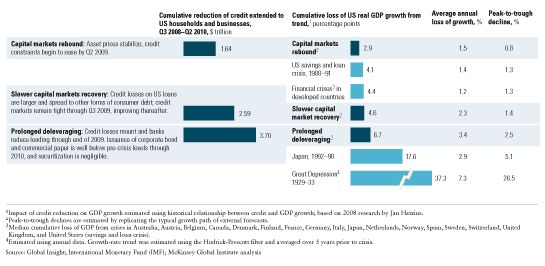 To see them in perspective, consider some results of the McKinsey Global Institute’s research (see sidebar, “The credit crunch and the real economy”). This research, focusing on the United States, the center of the storm, suggests that if capital markets rebound quickly, GDP would be 2.9 percentage points lower than it would have been if trend growth had continued over the next two years. If financial markets take longer to recover, as the middle two scenarios envision, US GDP growth could fall 4.7 to 6.7 percentage points from trend over the same period. At the “long freeze” end of the spectrum, Japan’s “lost decade” shaved 18 percentage points from GDP compared with its previous growth trend.