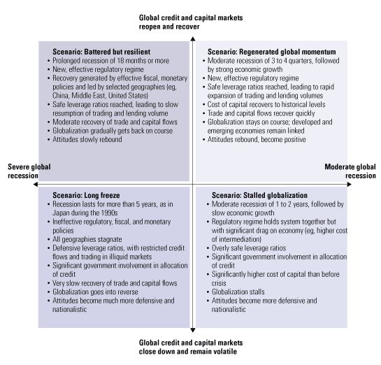 But these are not normal times: the range of potential outcomes—the uncertainty surrounding the global credit crisis and the global recession—is so large that many companies may not survive. We can capture this wide range of outcomes in four scenarios (exhibit).