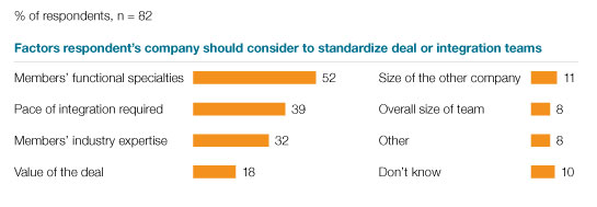 Looking at integration, executives of companies with standardized teams in place are significantly likelier to report that they have the right number and quality of people in place to meet their aspirations—more than 80 percent say so. This finding is consistent with our experience: we’ve seen that standardized deal teams tend to be both more experienced and more capable of realizing value that cuts across functions. Respondents who say that their companies don’t have standardized deal or integration teams most often cite functional skills as the factor to consider in standardizing team setups (Exhibit 5).