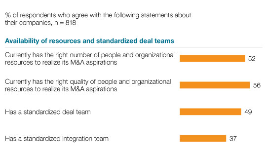 One reason so many companies fall behind at managing integration and cultural differences may be a lack of resources and formalization. Only a slim majority of respondents believe their companies have the right number of people and organizational resources to meet M&A aspirations, and only 49 percent report that their companies have standardized deal teams (Exhibit 4). Moreover, only a bit more than a third of the respondents report that their companies have standardized integration teams, and just over half report that their companies’ M&A capabilities rest in specific individuals rather than the institutions.