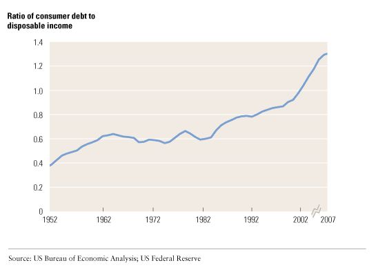 The way these dynamics played out is well known. US household debt started rising in the early 1980s, and its growth accelerated in 2001 (Exhibit 1). Leverage among Wall Street’s five largest broker–dealers (Goldman Sachs, Merrill Lynch, Lehman Brothers, Bear Stearns, and Morgan Stanley) rose dramatically after 2004, when the US Securities and Exchange Commission exempted these firms from the long-standing 12-to-1 leverage ratio limit and let them regulate themselves. From 1990 to 2007, the whole financial-services sector expanded 2.5 times faster than overall GDP, and its profits rose from their 1947–96 average of 0.75 percent of GDP to 2.5 percent in 2007. Then falling home prices led to an unanticipated rise in foreclosure rates and a drop in the value of certain mortgage-backed securities. That decline quickly undid highly leveraged financial firms, whose failure spread loss and uncertainty throughout the system. US consumer spending continued at a high level through the first half of 2008 but by the third quarter had dropped at a 3.1 percent annualized rate. A recession—potentially a deep one—had arrived.