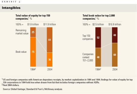 Tens of thousands of talented professionals work in mega-institutions—companies such as Citigroup, GE, and IBM each employ well over 100,000. These people create and exploit not only tangible assets such as capital but also intangible ones. To see the increased importance of intangible assets, consider the fact that book value accounted for only 36 percent of the market caps of the top 150 companies in 2004, as opposed to 75 percent in 1984. While this trend is relevant across many public companies, it is especially pronounced in mega-institutions. In fact, book value's share of the market caps of the top 150 companies has declined markedly relative to its share in the top 2,000, indicating that mega-institutions increased their physical capital more slowly than have other large companies (Exhibit 2).