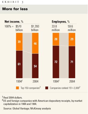 Today's mega-institutions also stand apart from companies that were their peers a decade or two ago in the way they have raised their profitability. On average, their economies of scale and scope have risen faster than the diseconomies associated with their increased complexity, or what economists call "the costs of excessive largeness." The mega-institutions' 2004 combined net income—nearly $650 billion—accounted for 46 percent of the combined net income of the top 2,000 corporations by market value, compared with 39 percent in 1994. But as the mega-institutions have increased their share of these companies' total net income, their share of the total workforce hasn't risen in proportion (Exhibit 3). To put the same point another way, the biggest companies boosted their average constant-dollar profit per employee from $21,000 in 1994 to $64,000 ten years later.