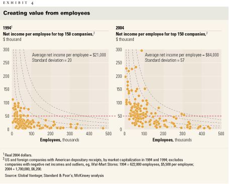 Averages don't tell the whole story. Within the top 150 companies, some earn much higher returns on capital and net income per employee than others. As recently as 1994, for example, only 25 companies in the top 150 netted more than $50,000 per employee (in 2004 dollars); by 2004, 79 did (Exhibit 4). By contrast, 41 companies among the top 150 in 2004 still earned less than $25,000 per employee. This increased variation didn't result from changes in industry mix or any specific metric. Indeed, such variations characterized nearly every industry represented in the list of the top 150 companies. A similar (though less pronounced) pattern of variation was also evident returns on invested capital.