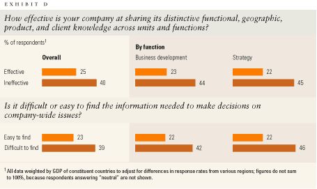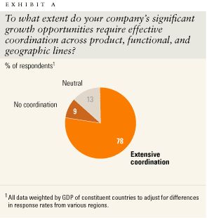 A large company's degree of complexity depends, first, on external factors, such as the difficulty or ease of reaching customers and of contracting with outside suppliers. It also hangs, in large part, on internal considerations, including the nature and organization of the work that employees perform. The unprecedented complexity of today's mega-institutions can overwhelm strategic initiatives and collaborative efforts; in fact, a majority of the executives polled in a recent McKinsey Quarterly survey5 said that their companies had become so complex over the past five years that seizing growth opportunities is now significantly harder. With management stressing the need to exploit the most important opportunities through internal collaboration across functions and products, the problem gets worse the larger a company grows (see sidebar, "Where complexity hurts").