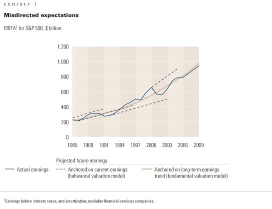 We used a similar approach to deal with the way investors form expectations about a company's future profitability. Using the growth trajectory of actual aggregate earnings for the S&P 500 companies during the past 40 years, the fundamental valuation model applies a fairly accurate trend line to realized earnings growth and then obtains an estimate for long-term growth (Exhibit 1). In the behavioral approach, we assumed that investors take current earnings as an anchor for projecting future earnings. As a result, during earnings peaks, such as in 2000, investor expectations tend to overshoot long-term future earnings, driving P/E ratios above their intrinsic levels. When earnings are below the trend line, as in 1992, investors tend to undershoot, so P/E ratios are low as compared with intrinsic value. This assumption is consistent with what we know of analysts' earnings forecasts, which also tend to be too high when markets peak and to be too low in troughs, both for the market and for cyclical companies.