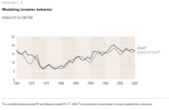 Both models converge on P/E ratios close to the long-term median of about 16. But the behavioral model, based on the investors' assumption that recent conditions will prevail over the long term, fits the actual, year-by-year P/E ratios better than the fundamental model does (Exhibit 2). In fact, when we calculate the relative differences, the P/Es from the behavioral model are mostly within 20 percent of the actual P/Es. The behavioral model reflects the importance of short-term inflation in explaining the variation of actual P/E levels over time. Changes in expectations about short-term inflation were clearly the most important drivers for changes in actual P/E levels in the 1970s and 1980s, for example.