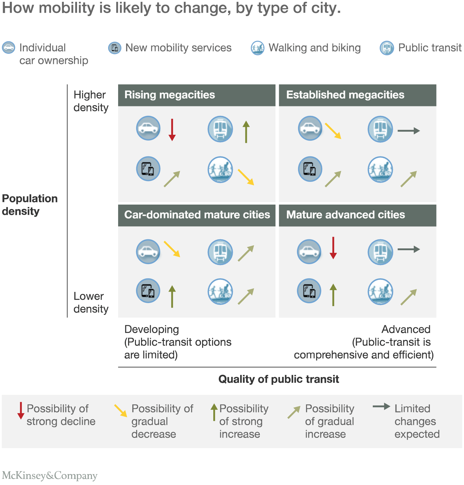 The speed and extent of the mobility transformation will differ. In this report, we lay out a framework that describes the evolution of urban mobility. We also highlight a set of urban archetypes, defined by population density and the maturity of public transit; each archetype can be expected to take a different path to mobility. Our analysis suggests that a mobility revolution is on the way for much of the world. As a result, we anticipate big improvements in the quality of life for city residents.