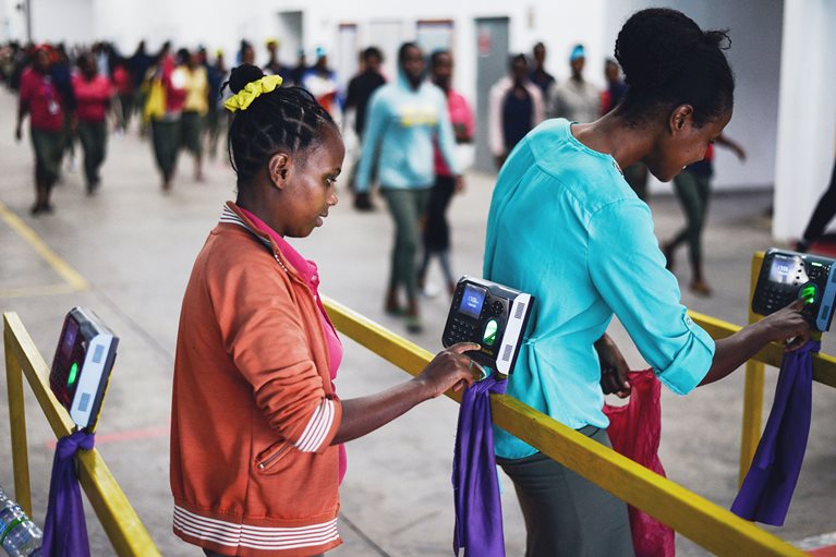 Employees at a textile company in Ethiopia check out after work by fingerprint.