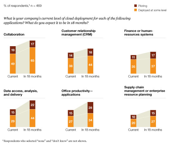 More than 80 percent of IT respondents say their companies are using or experimenting with cloud technology. Some 63 percent say their companies are using cloud-based applications in some aspect of day-to-day operations, and over the next 12 to 18 months, deployment and piloting is expected to increase across all application types explored in the survey (Exhibit 7).
