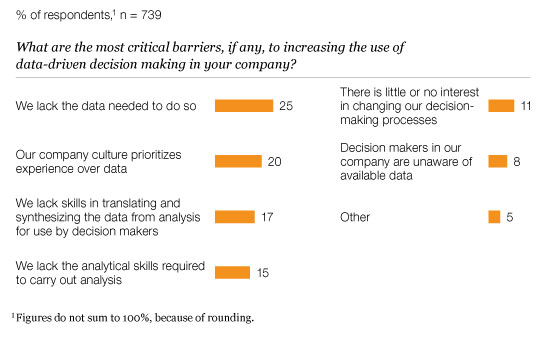 Respondents who have incorporated data and analytics into their decision making say the most significant benefits are the discovery of new insights (39 percent), significantly improved projections of future performance (34 percent), and faster decision making (29 percent). Despite optimism about the rising use of data in decision making, respondents also highlight a number of barriers to expanding adoption (Exhibit 5).