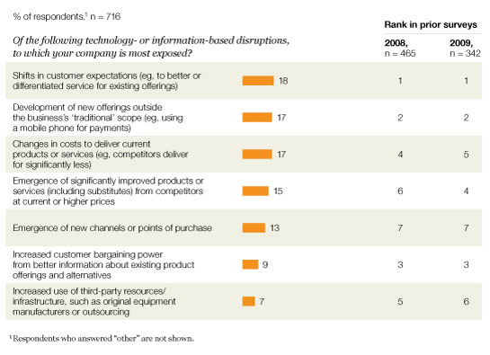 Technology, undeniably, is changing competitive dynamics. Respondents describe this as a double-edged sword: IT is both a competitive weapon and a source of disruption when used by competitors. For the third year running, executives say their companies are most vulnerable to two technology-enabled threats: rising customer expectations and significant changes in delivery costs (Exhibit 1). This year, as companies begin to consider a return to growth, two other concerns leapt up the list from much lower rankings in previous surveys: the emergence of new products or services from competitors and competitors’ development of new offerings outside their current scope, such as telecommunication companies offering cloud-computing services.