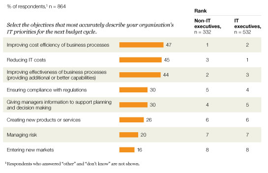 The somewhat better news for those managing IT is that pressure to slash costs while simultaneously responding to these threats has eased somewhat. Respondents report that IT is becoming more than a simple cost center in the minds of many executives. Compared with earlier surveys, a smaller share—23 percent—say IT’s primary contribution to the corporation is in delivering IT services at the lowest cost, down from 25 percent in 2009 and 33 percent in 2008. Instead, more IT and non-IT executives are expecting IT to help drive broader business efficiency (39 percent) and differentiated performance (21 percent) this year. These expectations are reflected in executives’ beliefs about current IT priorities for their organizations: two of the top three priorities center on using IT to improve business performance (Exhibit 2).