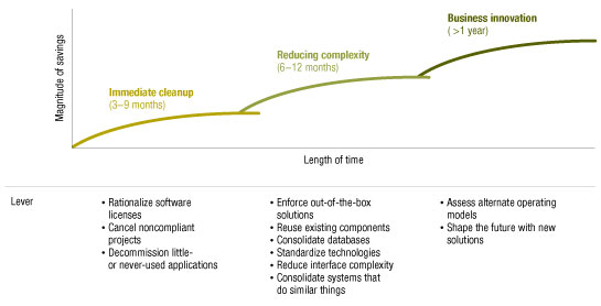 That’s why CEOs must engage a cross-company team of business unit and IT leaders in a no-holds-barred program of architectural review and transformation. We have found that a phased joint approach, focused on a series of cost reduction levers, can reveal and realize substantial savings far beyond the norm for IT-only initiatives. In fact, companies that take this route can also create more flexible and efficient architectures that will help them thrive when the downturn ends.