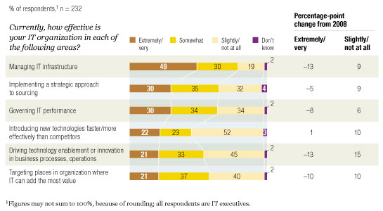 IT executives’ own view of their performance is less sanguine (Exhibit 4). Just under half of the IT executives surveyed say their management of IT infrastructure is extremely or very effective. Only 30 percent say their IT governance is extremely or very effective, and only 21 percent are happy with their ability to target places in their organizations where IT can add value (compared with 30 percent of non-IT executives who say IT is very or extremely or very effective on a corresponding measure).