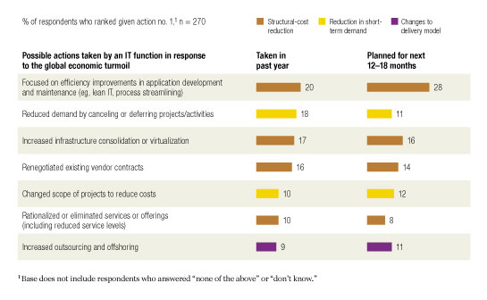Running a tight IT organization remains important, however. We asked IT executives about the actions they have taken in the past year, as well as those they plan to take in the next 12 to 18 months in response to the crisis (Exhibit 2). Respondents indicated a strong preference for structural cost reductions: three of the top four actions discussed focus on reducing structural costs through efficiency improvements, including applications development, infrastructure consolidation, and contract renegotiation. Looking ahead, two-thirds of the respondents report they plan to undertake structural cost reductions in the next 12 to 18 months.