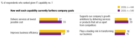 The value executives (both inside and outside the IT function) perceive IT as offering their companies has held up well since our previous survey, in October 2008.2 Respondents indicate that IT has become more important to improving business efficiency and reducing costs across the enterprise than it was last year. Notably, a smaller share of respondents indicate that their primary focus is to achieve the lowest IT cost (Exhibit 1). This suggests that executives are realizing better results from applying IT to solving problems across the business.3