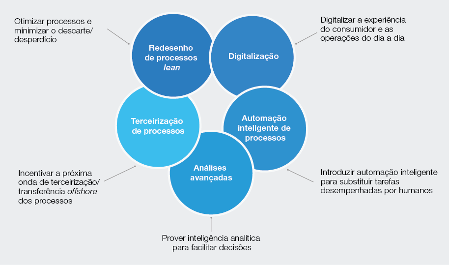 • Automação Inteligente de Processos (IPA) é um conjunto de novas tecnologias que combina o redesenho fundamental dos processos com automação robótica de processos e machine learning. IPA pode substituir os esforços humanos em processos que envolvem agregar dados provenientes de diversos sistemas ou extrair uma informação de um documento escrito e inseri-la como input de dado padronizado. Há também abordagens de automação que podem assumir tarefas com maior nível de sofisticação. Os exemplos incluem fluxos de trabalho inteligentes (para monitorar o status do processo de ponta a ponta em tempo real, gerenciar as transferências entre os diferentes grupos e fornecer dados estatísticos sobre gargalos), machine learning (para fazer previsões de modo independente com base em inputs e fornecer insights sobre padrões reconhecidos) e agentes cognitivos (tecnologias que combinam machine learning e geração de linguagem natural para desenvolver uma força de trabalho virtual capaz de executar tarefas mais sofisticadas). Para mais informações sobre IPA, consultar “Intelligent Process Automation: The engine at the core of the next generation operating model.”