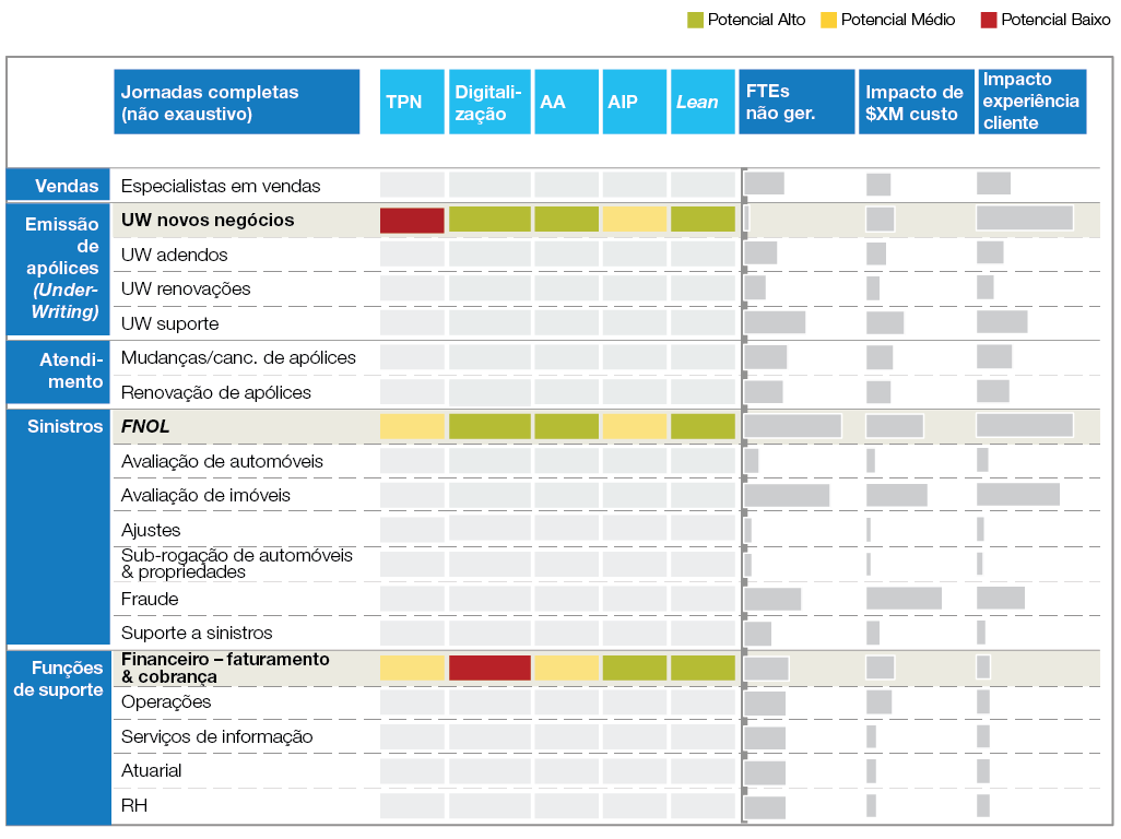 Algumas empresas desenvolveram heat maps para as jornadas de ponta a ponta que oferecem uma perspectiva de toda a empresa para a escala e o impacto potencial da oportunidade de cada alavanca em cada jornada. Esses mapas incluem estimativas de quanto os custos podem ser reduzidos (medidos em termos de métricas financeiras e de número de funcionários) e quanto a experiência do cliente pode ser aprimorada em cada jornada.