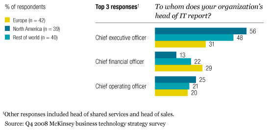 Responding to our survey, 71 percent of European IT and business executives said that IT must be tightly integrated with business strategy, but only 27 percent thought that this actually happened at their companies. In addition, fewer CIOs in Europe than in other regions report to the CEO (Exhibit 1): only 31 percent in Europe, versus 56 percent in North America, for example.6 This finding suggests that European companies continue to think IT leaders should focus on back-office operations rather than strategy and growth efforts.