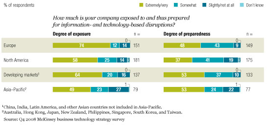 Seventy-four percent of the European IT and business executives we surveyed believe that their companies are very or extremely susceptible to disruptions stemming from IT (Exhibit 2)—a percentage higher than those in other regions—yet only 48 percent believe that their companies are very or extremely well-prepared for them. As for IT’s ability to transform the competitive landscape, some companies have yet to recognize the role of technology in helping them succeed: a third of the European IT and business executives we surveyed didn’t view IT as being among the top three levers for creating competitive advantage.