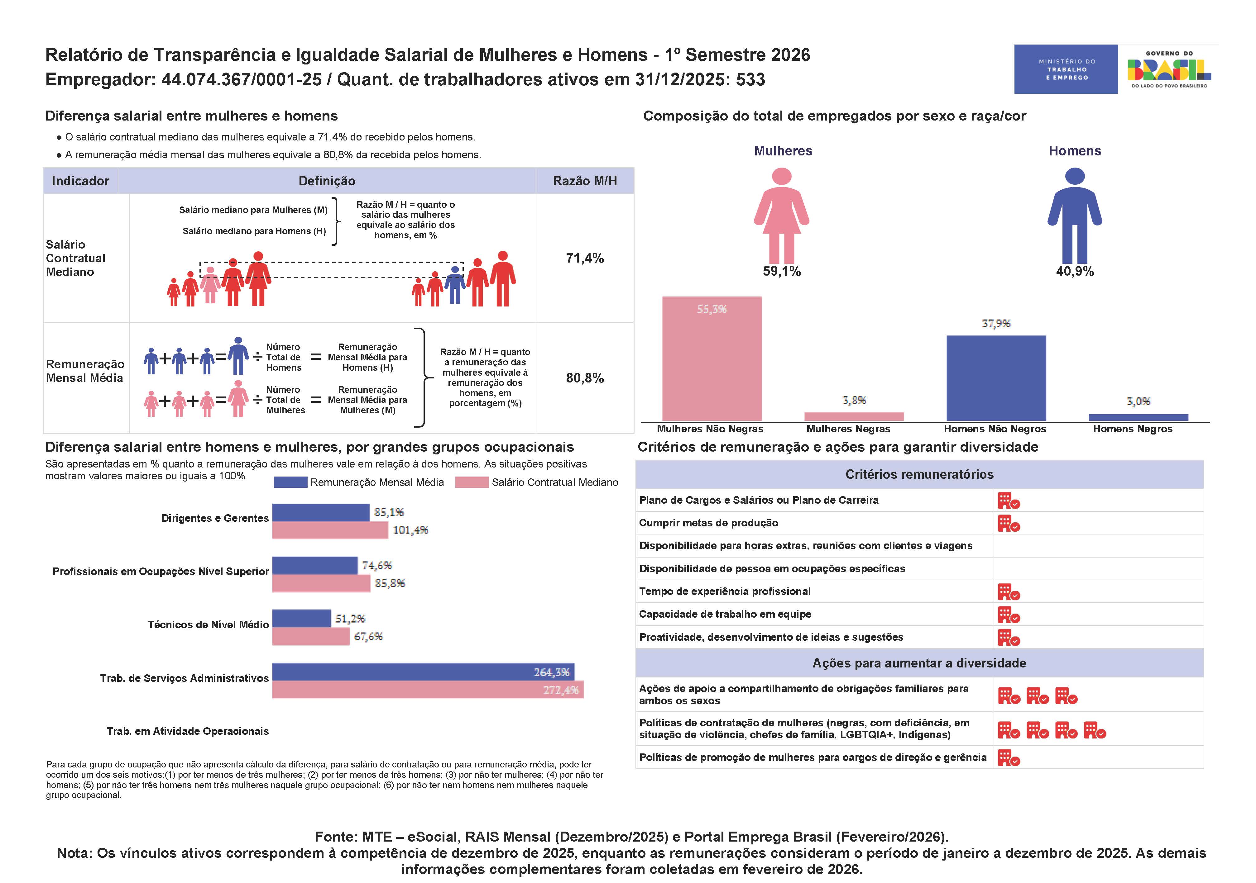 Clique aqui para acessar o Relatório de Transparência Salarial do primeiro semestre de 2026, elaborado pelo Ministério do Trabalho e Emprego.