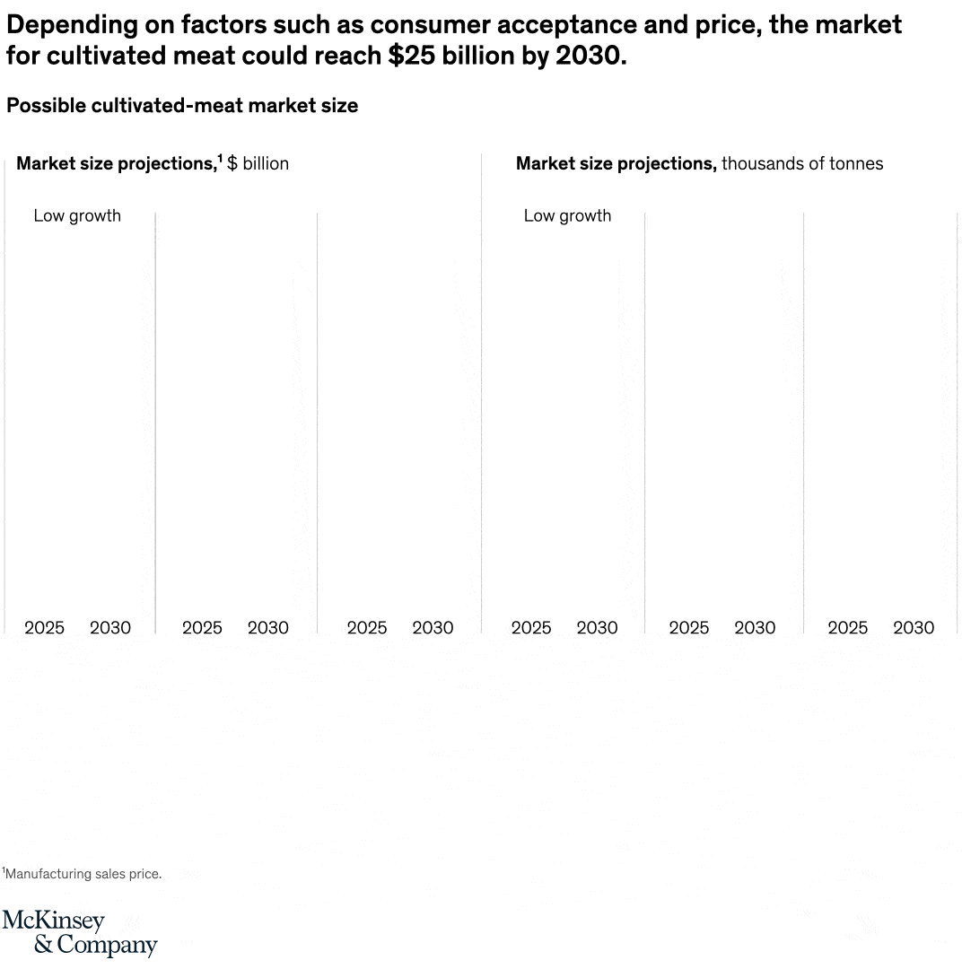 Cultivated meat has the potential to not just match but surpass the taste and texture of conventional meat, as well as to introduce novel products. If consumers take to these products, the market for cultivated meat could reach $25 billion by 2030 (Exhibit 3). Currently, the world primarily eats the meat of animals that are the easiest to farm industrially, but cultivated meat won’t face those constraints. Instead, the industry could select cell lines from specific animals with the best traits, such as Wagyu beef or wild salmon, and replicate them at the same cost as, say, beef patties or tilapia.