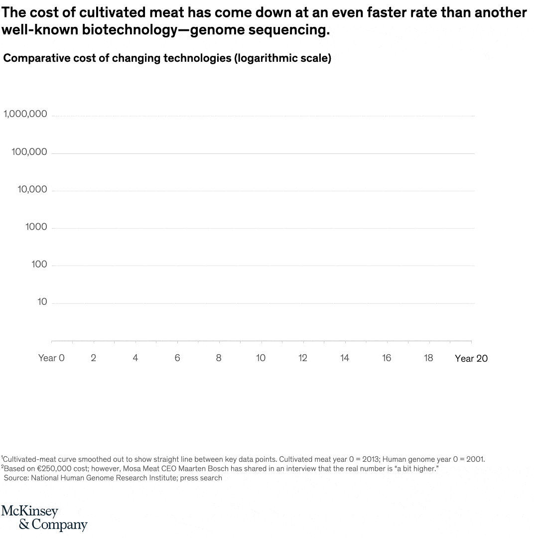 In less than a decade, companies have been able to reduce the production costs of cultivated meat by 99 percent. If costs follow the same trajectory as that of human genome sequencing (for which costs, on average, dropped by 45 percent annually between 2001 and 2021), cultivated meat can achieve cost parity with conventional meat by 2030 (Exhibit 4).