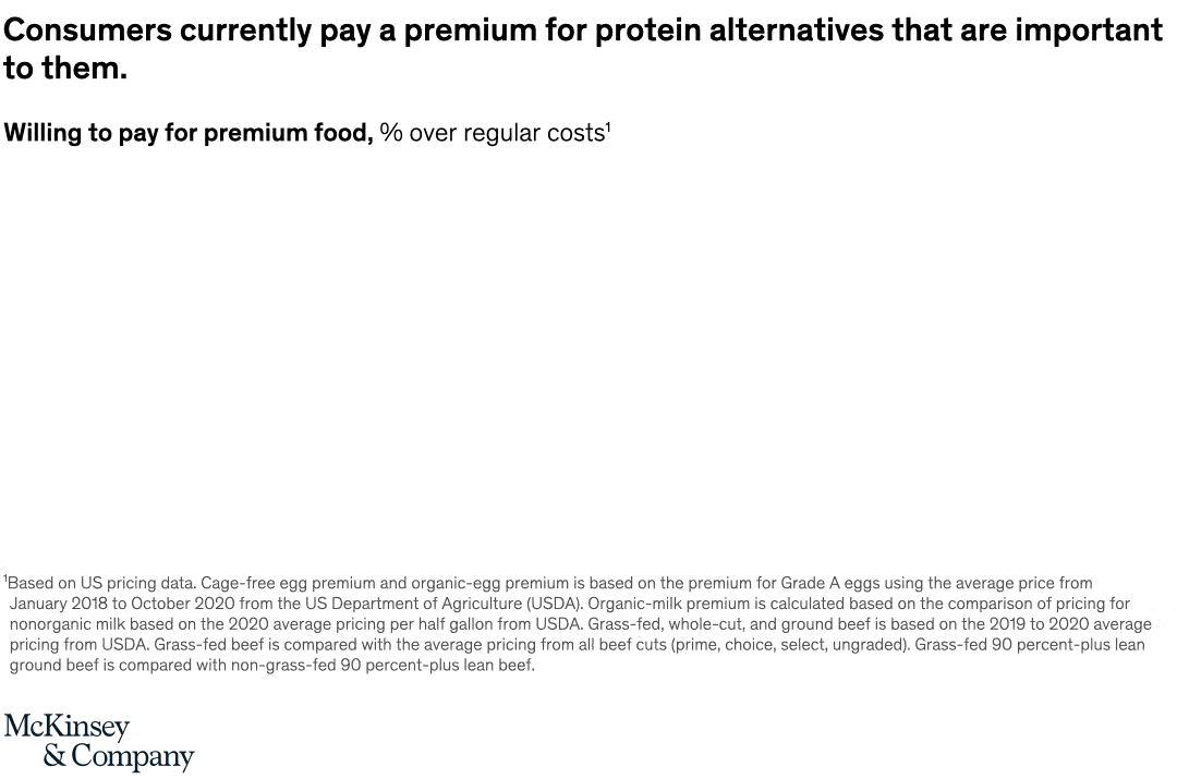 It could take about a decade for consumers to start paying less for cultivated meat than its conventional counterpart. However, there is evidence in today’s marketplace that consumers are willing to pay extra for products they believe to be healthier or more sustainable (Exhibit 5).