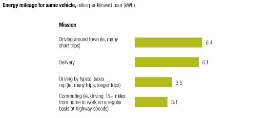 The reasons for focusing on the around-town market go well beyond shorter driving distances. Compared with vehicles powered by internal-combustion engines, battery-operated ones get better energy mileage (miles per kilowatt hour and thus per unit of energy storage) when driven at relatively low speeds on local streets, with a lot of stopping and starting (Exhibit 2). Representative driving missions include cars used in cities and in short-range suburban driving, as well as delivery vans and, perhaps, taxis. By our estimate, up to 38 million US households could purchase such a vehicle. The evidence is that they own at least two cars (so one can be used for more demanding activities), at least one has low annual mileage, and the households’ annual incomes suffice for electric vehicles.