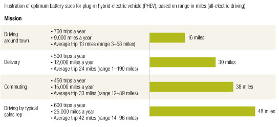 A segmentation by mission frees consumers from the need to pay for bigger cars and batteries than they actually need. Depending on how consumers use their vehicles, the battery size requirements (and thus upfront capital costs) and operating economics can vary quite substantially. The optimal battery size required for a plug-in hybrid driven around town is one-quarter that required by a sales rep.1 More important, the cost of the batteries is in proportion to their size—and at today’s current battery cost of $750 or so per kilowatt hour, size can translate into significant savings, sometimes many thousands of dollars. One implication is that companies offering only a plug-in hybrid with, for example, 40 miles of all-electric range may be undercut by manufacturers of much less expensive vehicles with just 10 or 20 miles of electric range and only marginally higher operating costs. This is because it is much less expensive to use gasoline to cover infrequent trips that exceed a PHEV’s all-electric range than to carry “spare” battery capacity.