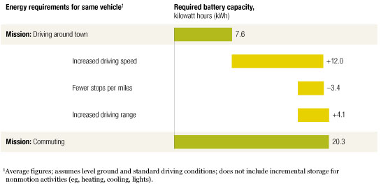 Let’s consider two common missions: driving around town and commuting. The latter’s substantially higher energy storage requirements don’t come mainly from the greater range required by a commuting car. Rather, the most significant factor is the higher average driving speed, and thus air resistance, encountered on freeways (Exhibit 1). The clear implication is that battery-powered vehicles suitable for the most energy-intensive driving missions, such as commuting, will overserve consumers who use their vehicles for shorter trips at lower speeds, such as running errands around town. Such vehicles won’t deliver the right value at the right cost.