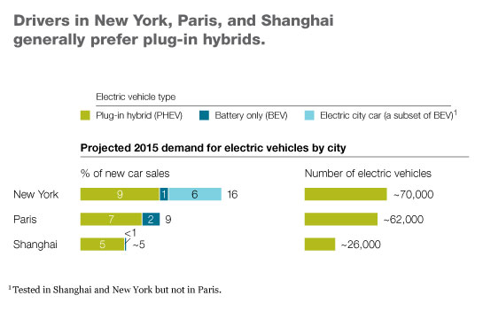 Yet our research on demand for electric cars in very large urban areas1 shows that plug-in hybrid electric vehicles and battery-only electric vehicles could account for 16 percent of overall new-car sales in New York, 9 percent in Paris, and 5 percent in Shanghai by 2015. That’s true even with today’s financial incentives and limited public charging facilities.2