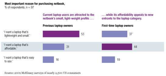 For consumer electronics manufacturers, entering the basics market poses challenges: they must rethink their approach to product development, moving away from efforts to push the limits of technology and focusing instead on features users really want. Our research found, for example, that durability was by far the most important aspect of quality for most consumer electronics customers. That’s why netbook manufacturers invest in features such as sturdy hinges rather than expensive components with high-end technical specs.