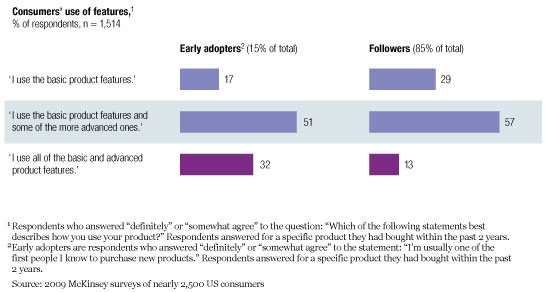 What’s driving the growth of the basics market? First, consumers are overserved. Our survey showed that less than a third of the respondents actually used all of the advanced features that manufacturers pile into their televisions, video cameras, mobile phones, and other products. What’s more, less than half of the respondents even knew these features existed (Exhibit 3). Second, people value lifestyle benefits over technical capabilities. Among respondents who owned a Flip camera, for example, 90 percent liked it because it is lightweight, easy to carry and use, and “lets me share memories with family/friends,” while only 60 percent said that video quality was important.