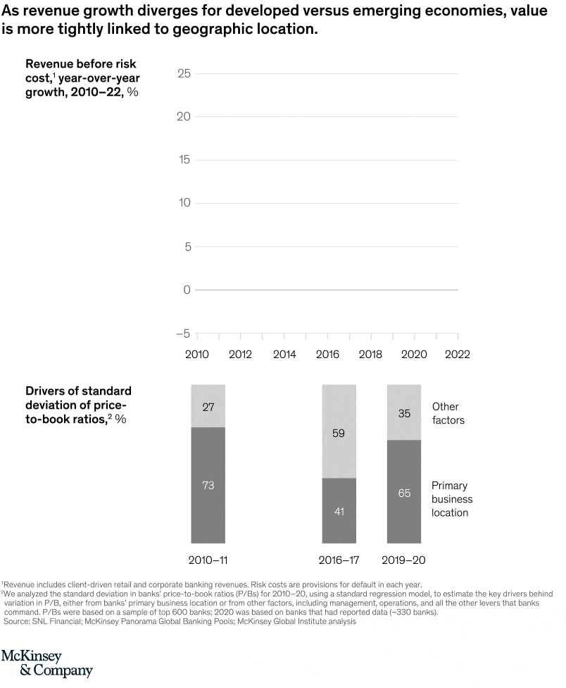 What is the key to outstanding performance in banking? Well, it depends on when you ask the question. In 2010, a bank’s core geographic market accounted for 73 percent of the standard deviation in price to book, or P/B (exhibit). At that time, emerging economies had been the global growth engine for the first half of the decade; logically, banks that focused on serving these regions could count on their markets’ growth to boost investors’ confidence in their strategy.