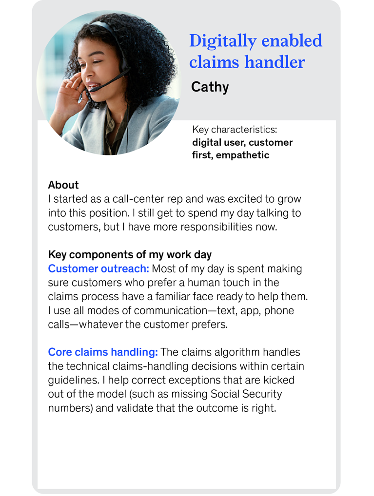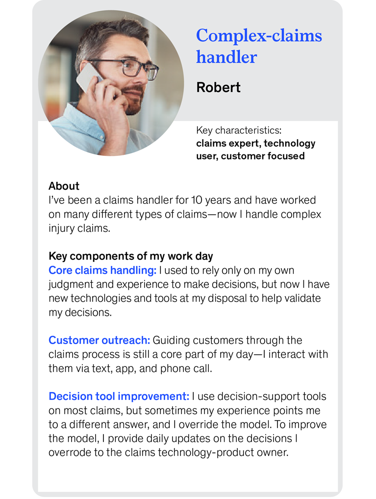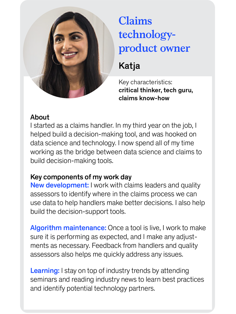 Claims technology-product owner.As automation evolves from process-centric automation to artificial intelligence that eventually replaces judgment-based work, algorithms will increasingly make decisions across key points in the claims process, from assessing coverage to assessing damage. While digitally enabled claims handlers and quality assessors will help validate algorithm output, claims technology-product owners will infuse technology and data science into the claims process. They will do this by designing, implementing, and maintaining algorithms using their robust knowledge of claims patterns and causes of loss. Individuals in this role will need deep claims-process experience, good pattern recognition, and fluency in technology.