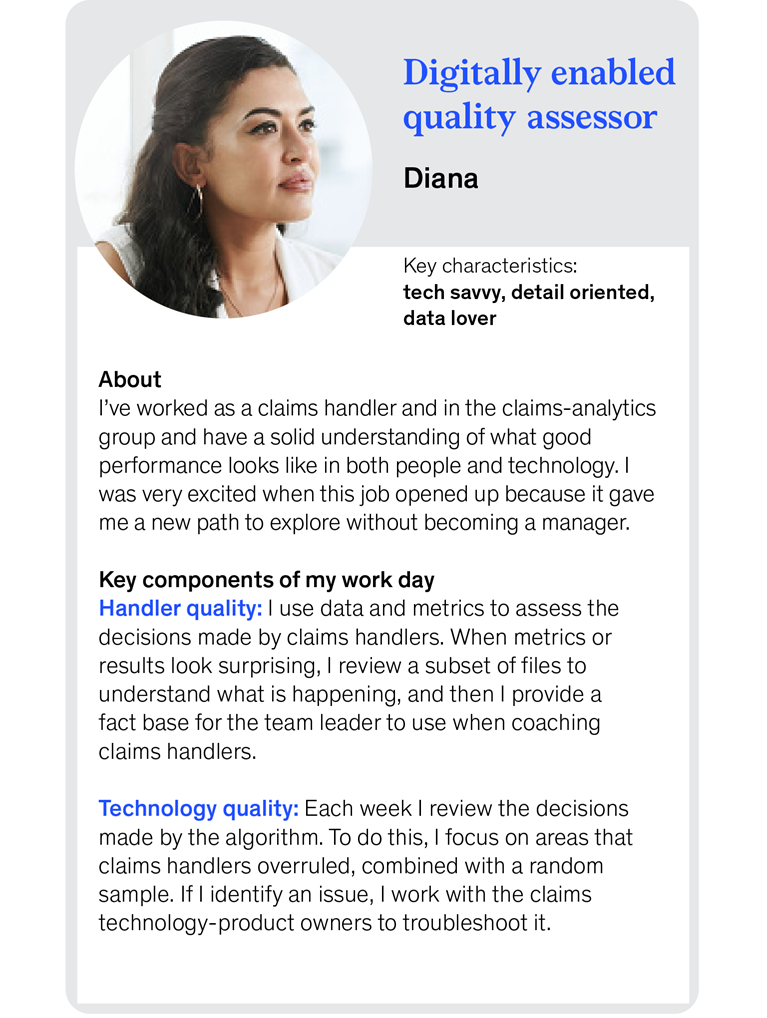 Digitally enabled quality assessor. A quality assessor’s main objective is to ensure the quality of claim outcomes. Over time, the scope of their role will expand from assessing only the judgments from claims handlers to include technology assessment. Assessors will become the standard bearers for what it means to properly process a claim; they will define the quantitative target for successful automation and validate that both handlers and adjudication algorithms can achieve it. Digitally enabled quality assessors will also help identify ways to improve nascent algorithms that may miss targets.