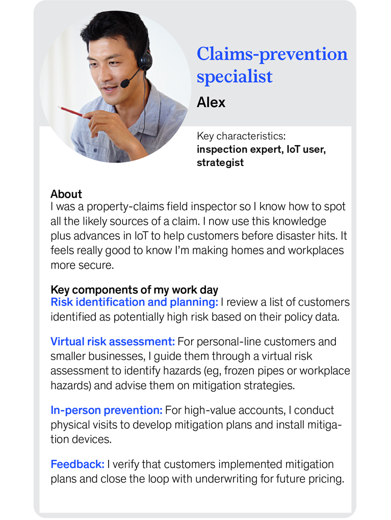 Claims-prevention specialist. Loss prevention is becoming increasingly important for claims organizations. Today, many are experimenting with prevention tools, such as “telematic” devices and IoT sensors. In the future, prevention specialists will benefit from telematics and precision analytics to help identify high-risk customer scenarios. Specialists can then conduct targeted and personalized outreach to mitigate the risks. They will also cement the link between underwriting and claims, providing additional input on incorporating policy risk into the pricing model. This feedback loop will enable insurers to provide better recommendations to customers on how they can lower their risk and maintain a healthy policy at the point of sale.