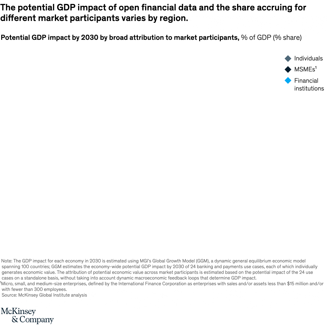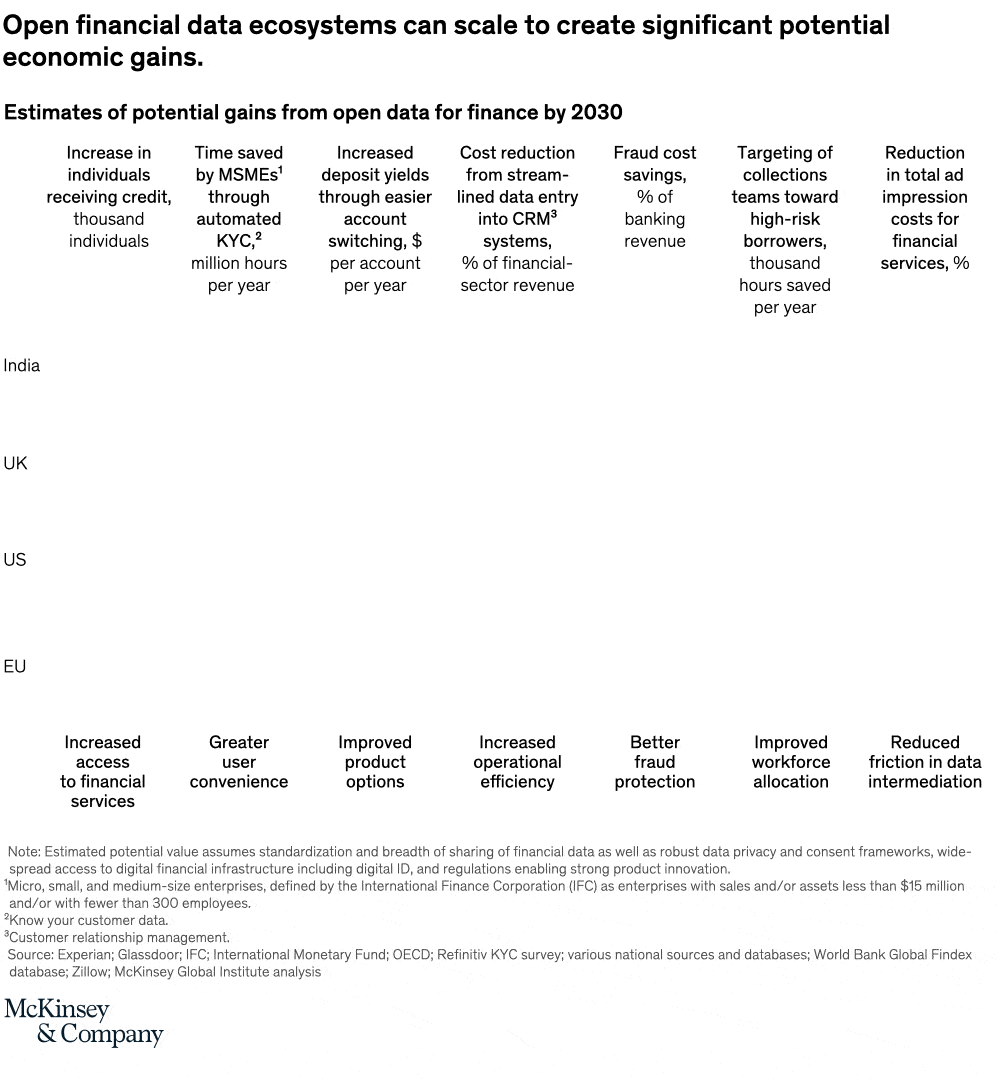 Our analysis suggests that the boost to the economy from broad adoption of open-data ecosystems could range from about 1 to 1.5 percent of GDP in 2030 in the European Union, the United Kingdom, and the United States, to as much as 4 to 5 percent in India. All market participants benefit, be they institutions or consumers—either individuals or micro-, small-, and medium-sized enterprises (MSMEs)—albeit to varying degrees.