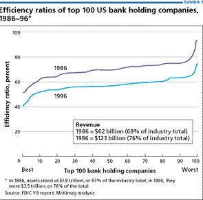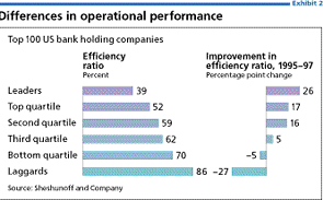 So while substantial costs have been taken out of the US banking system, scope remains to raise productivity further; indeed, much of the merger and acquisition activity of the past two years has been based on this premise. Though variations in business mix justify some structural differences in operating costs, the size of the gap between the absolute efficiency and improvement rates of the best-performing banks and those of the rest of the pack gives some indication of the potential (Exhibit 2).