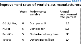 How then should banks go about capturing the extra productivity? The answer is: by looking at how manufacturers do it. Rates of improvement recorded by world-class manufacturing companies far exceed those attained by banks (Exhibit 3). Much of the reason can be found in lean manufacturing, a system of operational management developed by the Japanese car maker Toyota.