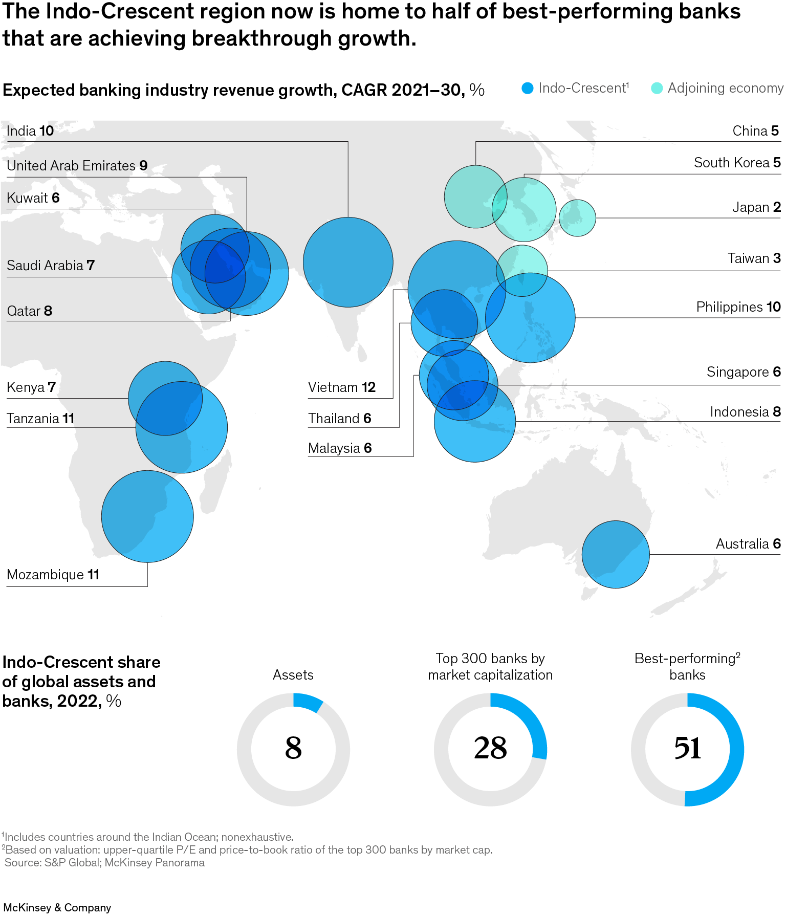 The geographic divergence we have noted in previous years also continues to widen. Banks grouped along the crescent formed by the Indian Ocean, stretching from Singapore to India, Dubai, and parts of eastern Africa, are home to half of the best-performing banks in the world (Exhibit 3). In other geographies, many banks buoyed by recent performance are able to invest again. But in Europe and the United States, as well as in China and Russia, banks overall have struggled to generate their cost of capital.