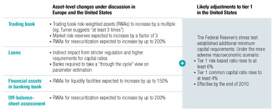 Already severe, the capital shortage will almost certainly get worse with the coming of new banking regulations. Ironically, the green shoots of economic recovery that many have noted may provide regulators with the faith they need to push through three changes that will particularly affect corporate and investment banks. First, most countries seem sure to impose a cap on banks’ leverage and to introduce “procyclical” adjustments to these such that in good times, the cap will grow tighter. Second, many believe that changes to the calculations used to measure risk in the trading book will increase RWAs by at least a factor of three (Exhibit 1). Off-balance-sheet items and securitized assets will also likely be saddled with much higher capital requirements. Finally, the focus will shift more toward tier-1 and common tier-1 capital (consisting mainly of common shares, cash reserves, and retained earnings), thus limiting the usefulness of the hybrid structures that many banks now employ to ensure capital adequacy.