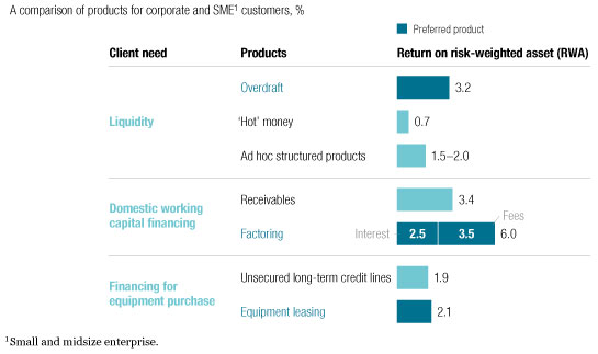Sell the right products and get the right collateral. Banks should provide commercial guidelines and tools to help the front line meet two goals: to sell the product with the highest RWA-adjusted return for a given customer need and to boost the level or quality of collateral wherever possible, without jeopardizing that return (Exhibit 5). To achieve both goals—that is, a product and collateral that are optimized for both economic value added (EVA) and RWA returns—frontline staff must have transparency into RWA under Basel II, and their incentive schemes must be set accordingly.