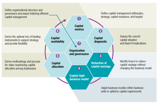 All these regulatory changes are in different stages of development and implementation but will likely come to pass over the next few years. While many banks are still struggling to come to grips with capital management, leading banks have recognized the trend and are establishing or recommitting to a comprehensive approach to capital management. Exhibit 2 lays out the seven building blocks common to the best of these approaches.